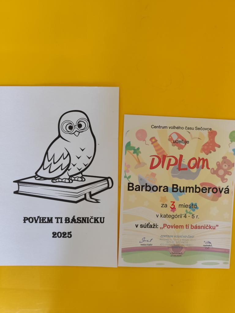 Vo štvrtok 27.03. sa v CVČ Sečovce konala súťaž v prednese škôlkarov. Našu škôlku krásne reprezentovala Barborka Bumberová a odniesla si diplom za 3.miesto.